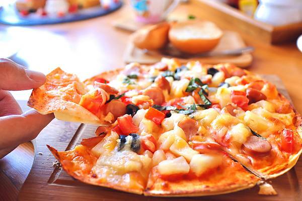 八吋脆皮吃起來很爽口,燻腸加上鳳梨的酸甜感與彩椒和黑橄欖的搭配,酸酸鹹鹹,相當獨特好吃,馬上就被清空